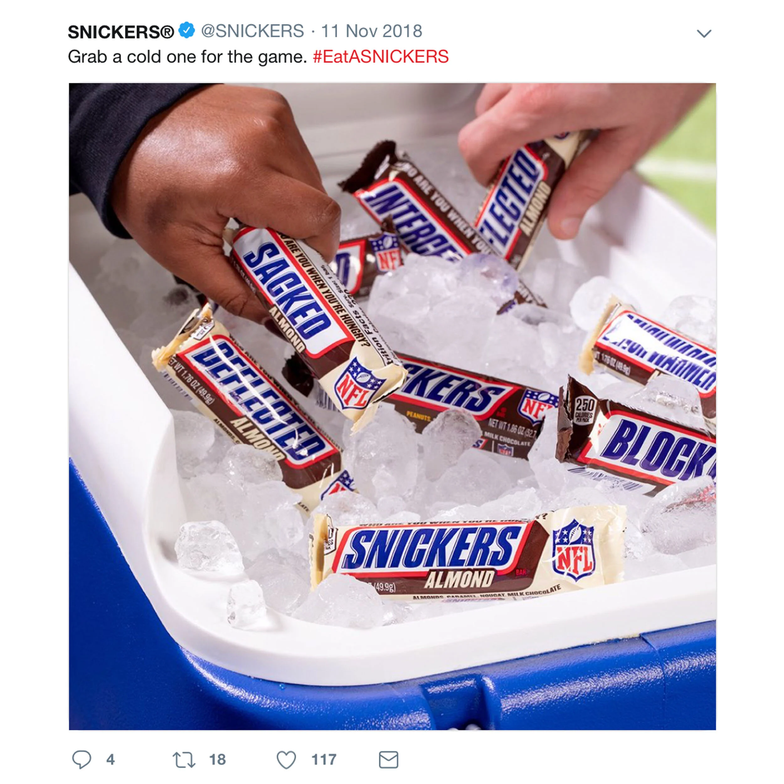 1 | HUNGER HANDOFF: When we’re hungry, we’re off our game. But when hunger happened on the field during Monday Night Football, fans chatting with Snickers scored free bars. Snickers intercepted NFL fandom and turned social engagements into sales.